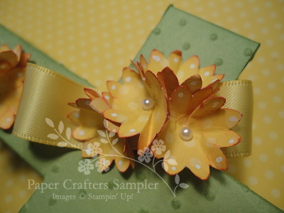 The Wasabi base of the Cross was run through the Perfect Dots embossing folder. The flowers were created with the ever so versatile Boho punch and Bold Bright designer paper, followed by sponged edges using a tangerine dye pad. Finish off with the addition of some self-adhesive basic pearls smack-dab in the center.